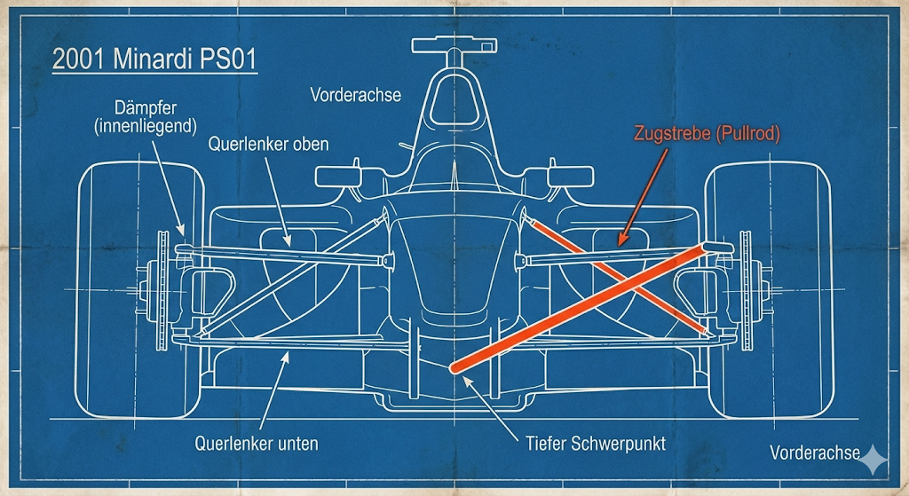 In der modernen Formel 1, in der Budgetgrenzen und Windkanal-Restriktionen den Wettbewerb nivellieren sollen, wirkt die Geschichte von Minardi fast wie ein Märchen aus einer anderen Zeit. Besonders die Jahre 2001 bis 2005 unter der Führung von Paul Stoddart markieren eine Ära des extremen Improvisationstalents. Die Fahrzeuge vom PS01 bis zum PS04B waren keine jährlichen Neuentwicklungen, sondern Glieder einer einzigen, ununterbrochenen Evolutionskette. Dieser Artikel analysiert die technische DNA dieser Boliden und zeigt auf, wie Ingenieure in Faenza mit minimalen Mitteln die Physik herausforderten.