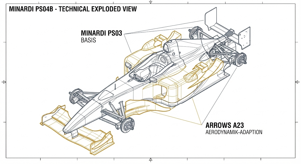 Der PS04B war mechanisch ein Minardi PS03. Er nutzte das bewährte Monocoque, die zuverlässige Pushrod-Aufhängung und das legendäre Titan-Getriebe.