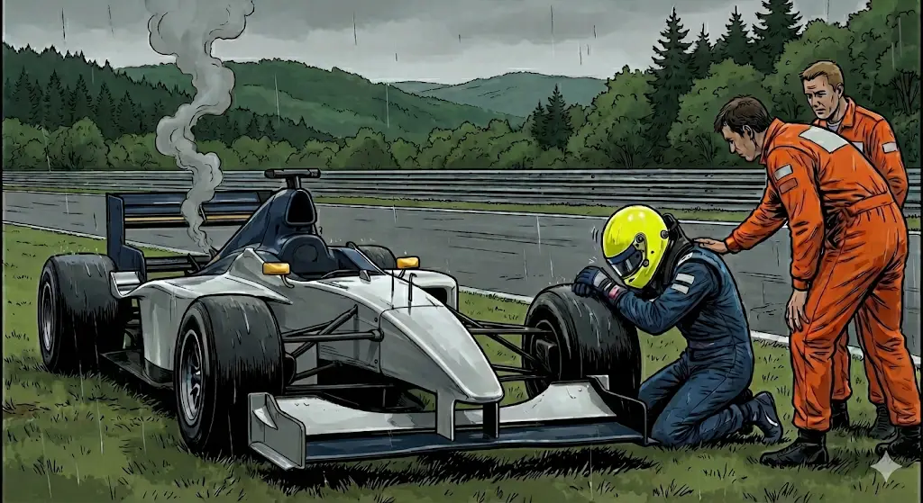 Was nun folgte, ging als „Der Fluch der Führung“ in die Geschichte ein. Heinz-Harald Frentzen dominierte das Geschehen nach Belieben. Er hatte den Sieg und damit die WM-Führung vor Augen. Nach seinem ersten regulären Boxenstopp in Runde 32 passierte jedoch das Unfassbare: Frentzen fuhr aus der Boxengasse, beschleunigte in die erste Kurve, und plötzlich starb der Jordan-Motor ab. Ein vergessenes System-Reset oder ein Elektronikdefekt legte das Auto lahm. Frentzen rollte fassungslos aus. Der Traum vom Heimsieg und der möglichen Weltmeisterschaft war in Sekundenbruchteilen zerplatzt.